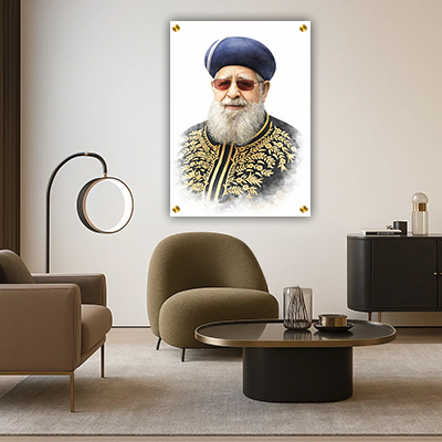 השילוב בין דיוקן תורני לעיצוב נקי ובהיר יוצר תמונה מרשימה שמכניסה לחלל השראה, חכמה ונוכחות רוחנית.