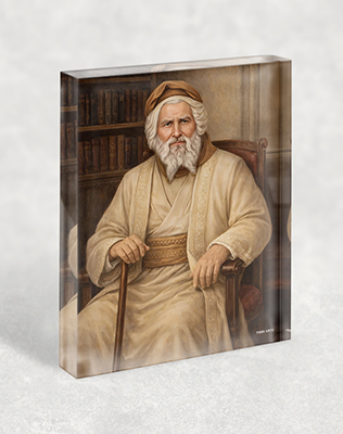 ההדפסה על בלוק אקרילי מעניקה עומק ונוכחות מוחשית. האור מדגיש את פרטי הפנים, את מקל העץ ואת הספרים שברקע. היצירה נראית ברורה ומרשימה מכל זווית.