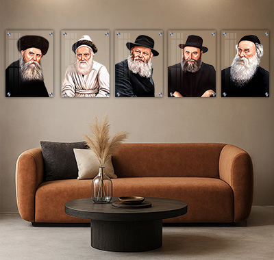 הסט מציג חמישה דיוקנאות של אדמו״רי חב״ד בעיצוב נקי ומכובד, כאשר כל תמונה מודפסת על זכוכית שקופה שמדגישה את עומק הדמות ואת תחושת האור שסביבה. השקיפות יוצרת מראה קליל ויוקרתי, ומעניקה לכל דיוקן נוכחות חדה וברורה.