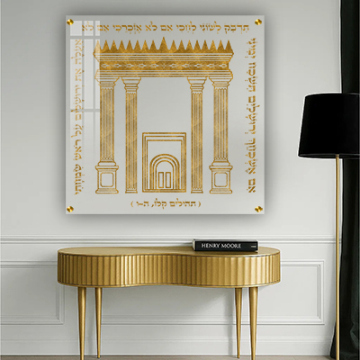 העיצוב מודפס על זכוכית מחוסמת שקופה שמדגישה את הברק של הצבע הזהב ואת קווי האיור הדקים. השילוב בין הזכוכית השקופה לבין הזהב יוצר מראה יוקרתי ומרשים. כך מתקבלת יצירה שמשלבת זכר לחורבן בית המקדש עם עיצוב נקי שמתאים לכל בית יהודי.