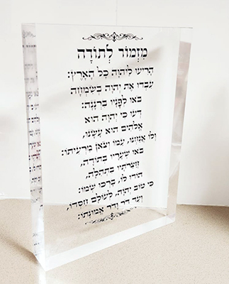 ברכת "מזמור לתודה" מוצגת על זכוכית שקופה מסוג אקסטרה קליר, עם כיתוב שחור אלגנטי וקריא. הצבע הניטרלי משתלב בכל עיצוב ומדגיש את הטקסט ברוגע ועומק.