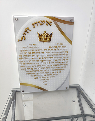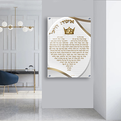 ברכת אשת חיל מופיעה בצורת לב, עם כיתוב מוזהב על רקע לבן נקי. העיצוב מעביר מסר ברור – את מלכה. כל מילה זורמת עם קווי הלב ומחברת לרגש, לכבוד ולאהבה עמוקה.