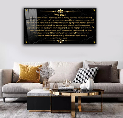התמונה מעוצבת בגווני שחור וזהב עם קישוטים עדינים למראה קלאסי ונקי. תמונה של ברכת אשת חיל מעוצבת היא המתנה המושלמת לכל אישה. ניתן להוסיף ברכה אישית כחלק מההדפסה על הקנבס או הזכוכית. אפשר לשלב את תמונת האישה לצד ברכת אשת חיל, ובכך לקבל מתנה ייחודית ומרגשת. הלקוח מקבל ליווי מקצועי, עריכה גרפית וסקיצות מותאמות אישית ללא הגבלה עד לקבלת התוצאה הרצויה. תמונה של ברכת אשת חיל מודפסת על זכוכית מחוסמת 6 מ"מ עובי אקסטרה קליר. הזכוכית מחוסמת ובטיחותית המודפסת בטכנולוגיית UV מתקדמת או על קנבס איכותי לבחירתכם. אנו מדפיסים מגוון רחב של מידות התאמה אישית. תמונת זכוכית או קנבס של ברכת אשת חיל מתאימה לכל חלל מרכזי בבית, כגון סלון, מטבח ואפילו חדר שינה. התמונה מוסיפה אור וקדושה לצד מראה מודרני, נקי ואלגנטי. כמה עובדות על ברכת אשת חיל: המזמור "אשת חיל" נכתב על ידי שלמה המלך, ומזמור זה חותם את ספר משלי. המזמור אשת חיל הינו שיר הלל לאישה שיופיה מלווה בפנימיות. המזמור מכיל בתוכו ביטויים שכולנו מכירים כגון: "אשת חיל מי ימצא, "שקר החן והבל היופי", "רבות בנות עשו חיל ואת עלית על כולנה". יש הנוהגים לזמר את הפרק "אשת חיל" לפני הקידוש בליל שבת כאות הערכה לאישה. ברכת אשת חיל בנויה מ-22 פסוקים, כמספר אותיות א"ב, כך שמתחילת המזמור ועד סופו נמצא את אותיות הא"ב כסדרן. באתר שלנו יש דגמים רבים של ברכת אשת חיל במגוון רחב של סגנונות, בדגש על שילוב יודאיקה, קדושה ואמנות לתוצאה הסופית המושלמת. תמונת זכוכית או קנבס של אשת חיל מבטיחה לכם מתנה שהאישה המיוחדת תהיה נרגשת מאוד לקבל. למידע נוסף ניתן לפנות אלינו בטלפון, בווצאפ או במייל.