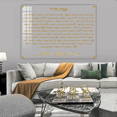 הטקסט של ברכת אשת חיל מופיע על זכוכית שקופה ואיכותית במיוחד (אקסטרה קליר).
