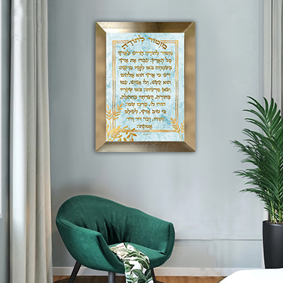 ברכת מזמור לתודה היא אחד המזמורים המוכרים ביותר בקרב העם היהודי. התמונה מעוצבת על רקע תכלת עם עלים וכיתוב בזהב עדין. מזמור לתודה נמצא בפרק ק' בתהילים והינו המזמור ה-100 בספר תהילים. בברכת מזמור לתודה יש סגולות רבות וזוהי תפילת הודיה לבורא עולם העושה איתנו חסדים וניסים בכל יום ויום. בברכת מזמור לתודה ישנה קריאה לעבוד את בורא עולם, להריע לו, להלל ולשבח את שמו. תמונה של מזמור לתודה משדרגת כל קיר. ניתן לתלות אותה בבית, במשרד או אפילו בבית כנסת. התמונה משרה קדושה ומספקת תחושת ביטחון והשראה לכל מקום. במידת הצורך, ניתן להוסיף כל כיתוב אישי שתרצו. ברכת מזמור לתודה – הדפסה על זכוכית מחוסמת 6 מ"מ עובי, אקסטרה קליר. הזכוכית מחוסמת ובטיחותית ומודפסת בטכנולוגיית UV מתקדמת, או הדפסה על קנבס איכותי לבחירתכם. למידע נוסף ניתן לפנות אלינו בטלפון, בווצאפ או במייל ונשמח לעזור.