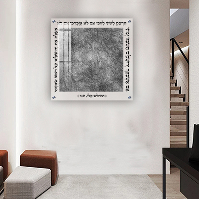 יצירה זו מציגה זכר לחורבן בית המקדש בעיצוב נקי ומדויק המתאים לקיר הבית היהודי. במרכז הזכוכית מופיע ריבוע אפור כסוף שמכסה את אזור הגלופה שנהוג להשאיר בקיר. הריבוע יוצר מוקד ברור לעיצוב ומדגיש את מרכז היצירה. סביב הריבוע מופיע הפסוק המפורסם אם אשכחך ירושלים. האותיות מודפסות בצבע שחור ולכן הן בולטות היטב על רקע הזכוכית השקופה.