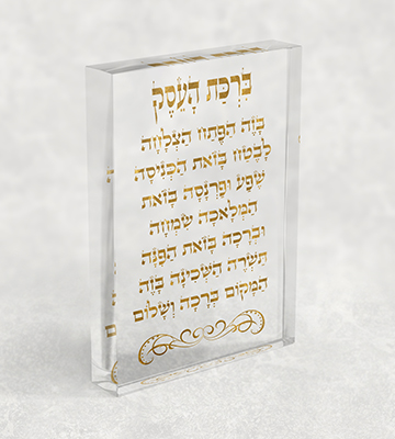 ברכת העסק מודרנית – מודפסת על זכוכית מחוסמת שקופה עם כיתוב זהב