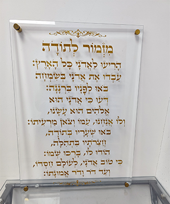 ברכת "מזמור לתודה" מופיעה בכיתוב זהב ברור, על גבי זכוכית שקופה מסוג אקסטרה קליר. הטקסט בולט באצילות ויוצר תחושת נוכחות מיידית, גם מבלי צבעים חזקים או רקע עמוס.