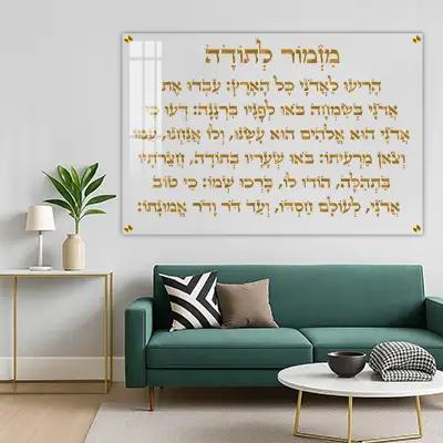 מזמור לתודה מחזק תחושת הכרת הטוב ואמונה יומיומית. התמונה מוסיפה אור וחום לסלון, לפינת אוכל או לכניסה לבית. היא משתלבת היטב בעיצוב מודרני ומינימליסטי.