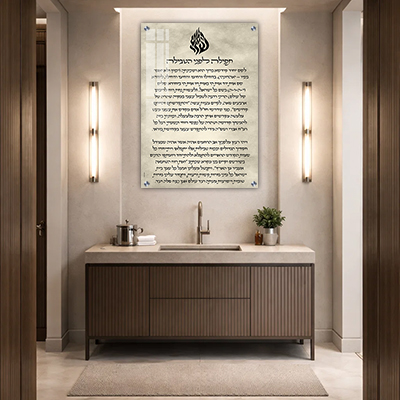ניתן להדפיס את הברכה על קנבס למראה חמים ואמנותי. אפשר גם לבחור זכוכית מחוסמת או פרספקס (זכוכית אקרילית) לקבלת מראה חד ומבריק. כל אפשרות מדגישה את הטקסט ואת הסמל בצורה ברורה ומרשימה.