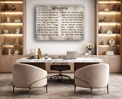 פיוט אדון עולם מופיע כאן בעיצוב מרשים שמדגיש את עומק המילים ואת המשמעות הרוחנית. הטקסט ניצב במרכז בצורה ברורה ונוחה לקריאה. הקומפוזיציה שומרת על איזון ומובילה את המבט לאורך הפיוט בצורה זורמת. כך מתקבלת יצירה שמכניסה השראה ורוגע לכל חלל.