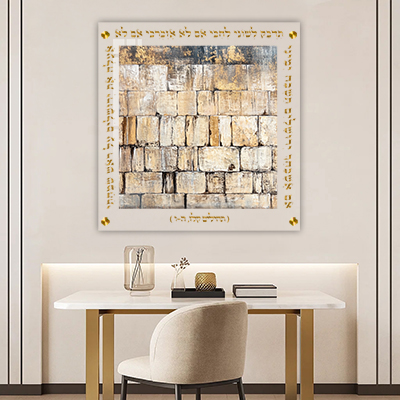 העיצוב מודפס על זכוכית שמדגישה את הברק של האותיות בזהב ואת פרטי ציור הכותל. הזכוכית מעניקה עומק, חדות ומראה אלגנטי שמתאים לעיצוב בית מודרני או קלאסי.