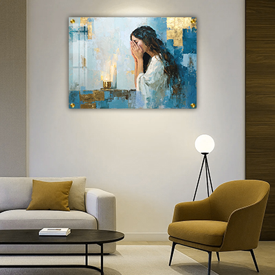 הרקע מעוצב בסגנון אבסטרקט מודרני בגווני כחול עם נגיעות זהב. השילוב בין הצבעים מעניק עומק ותחושת רוגע, ובמקביל מדגיש את האור של הנרות ואת הדמות המרכזית. הטקסטורה האמנותית מוסיפה תנועה ועדינות ליצירה.