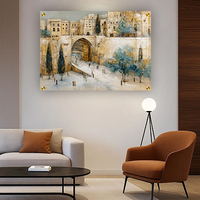 ציור עדין של חומות ירושלים בסגנון צבעי מים יוצר תחושת רוגע וזרימה טבעית. הגוונים נמסים זה בזה ומדגישים את קווי האבן בצורה רכה ולא חדה. כך מתקבלת יצירה שמביאה עומק שקט ואווירה ירושלמית נעימה לכל חלל.