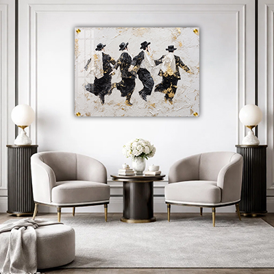 ציור עדין ומלא תנועה של חסידים רוקדים בסגנון צבעי מים יוצר תחושת זרימה טבעית ושמחה פנימית. הגוונים מתמזגים זה בזה ומדגישים את התנועה של הדמויות בצורה רכה ולא חדה. כך מתקבלת יצירה שמכניסה לחלל אווירה רגועה לצד אנרגיה חיה.
