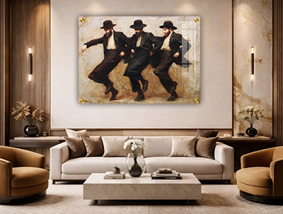 ציור חי ודינמי של שלושה חסידים רוקדים יוצר תחושת שמחה מתפרצת ואחדות. הדמויות נעות בקצב אחיד, מחוברות זו לזו בתנועה טבעית שמדגישה את הקשר והאנרגיה ביניהן. הקומפוזיציה הפתוחה מאפשרת לעין לזרום יחד עם הריקוד ולהרגיש את הקצב והחיות שבציור.