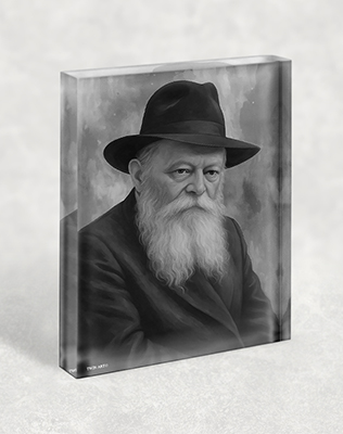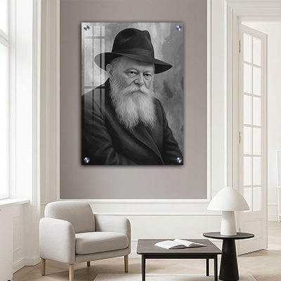 התמונה מציגה את הרבי מליובאוויטש בסגנון ריאליסטי נקי בשחור לבן. הקווים החדים והניגודיות העדינה יוצרים מראה מרשים ומכובד. הדיוק בפרטים מדגיש את עומק המבט ואת השקט הרוחני שבוקע מהציור. השילוב בין הפשטות לבין העוצמה החזותית מעניק ליצירה נוכחות חזקה שמתאימה לכל חלל.
