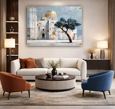 התמונה משתלבת נהדר לצד יצירות נוספות בסגנון מודרני ויוצרת קיר בעל נוכחות אמנותית חזקה עם חיבור שקט ומרגש לקבר רחל.