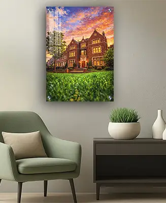 ציור אמנותי של מבנה 770 חב"ד בשקיעה על קנבס או זכוכית