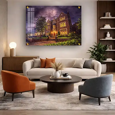 941 – ציור דיגיטלי של מבנה 770 חב"ד בשעת ערב על קנבס או זכוכית