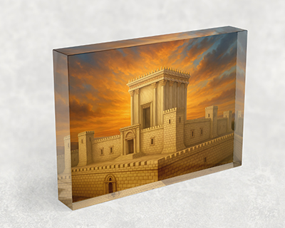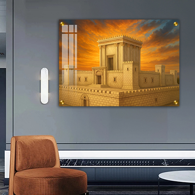 הציור מציג את בית המקדש השלישי ברגע עוצמתי של שקיעה. קרני השמש חודרות דרך השמיים הצבועים בגווני כתום וזהב. האור מדגיש את פרטי המבנה ומכניס תחושת התעלות.