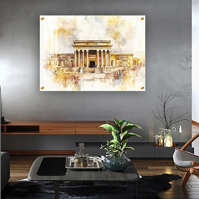 הציור מציג את בית המקדש בסגנון צבעי מים עדין, עם נגיעות לבן וזהב המוסיפות אלגנטיות ואור. כל פרט בציור משדר רוך, השראה ורוחניות.