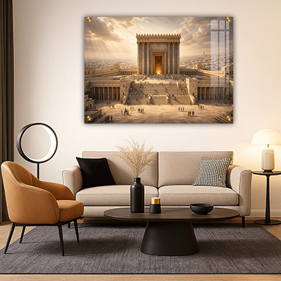 תמונה ריאליסטית של בית המקדש באור יום מבטאת בהירות, תקווה ועוצמה. קרני השמש שמאירות מאחור יוצרות תחושת התחדשות וחיבור עמוק לשורשים. כך היצירה מוסיפה לחלל אור, השראה ונוכחות מרשימה בכל יום מחדש.