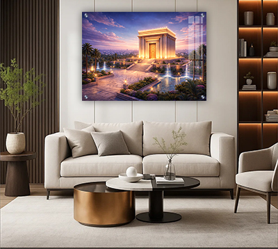 תמונה של בית המקדש מואר בשעת בין ערביים מבטאת תקווה, יופי ונשגבות. השילוב בין אור זהוב, שמיים סגולים ורודים ורחבה חיה מלפנים יוצר חוויה מרגשת שמלווה את בני הבית בכל יום מחדש.