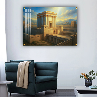הקומפוזיציה משלבת אדריכלות מרשימה, צבעים חמימים ותאורה שמדגישה את תפארת המקדש. ניתן להדפיס את הציור על קנבס בגימור מרקם עשיר, או על זכוכית בגימור מבריק ונקי – בהתאם להעדפה האישית ולעיצוב החלל.