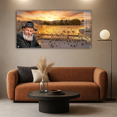 הגוונים החמים של השקיעה משתלבים עם נוכחותו השקטה והעוצמתית של הרבי. הרקע הירושלמי מוסיף ממד היסטורי ורוחני, והופך את היצירה לפריט מרגש שמתחבר לכל לב יהודי.