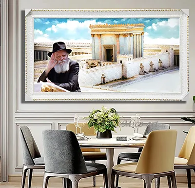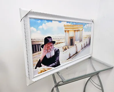 הפורמט המלבני מדגיש את הפרספקטיבה הרחבה – מהרבי ועד בית המקדש. הרקע הבהיר והנקי מבליט את הדמות ויוצר עומק רגשי ורוחני.