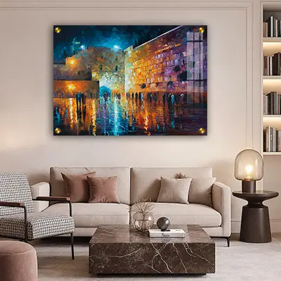 התמונה משתלבת בקלות לצד יצירות נוספות מירושלים ויוצרת קיר עוצמתי שמכניס את קדושת הכותל אל תוך הבית באווירה לילית מיוחדת.