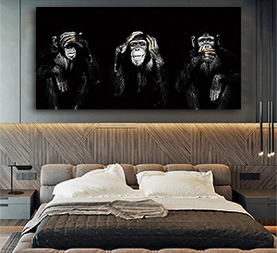 A-112 תמונה פנורמית על זכוכית או קנבס של שלישיית קופים. לא שומע, לא רואה, לא מדבר