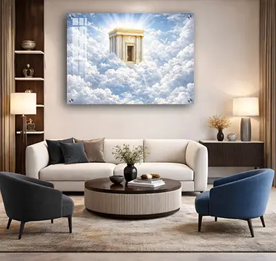 תמונה של בית המקדש בתוך העננים מחברת בין שמיים לארץ ויוצרת נוכחות רוחנית ברורה בחלל. היצירה מציגה את בית המקדש מעל שכבות עננים בהירים, עם אור זוהר שמדגיש קדושה ועוצמה.