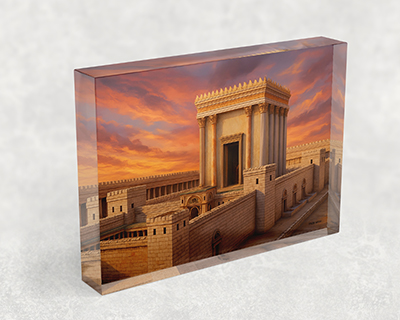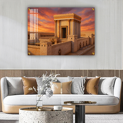 ציור עוצר נשימה של בית המקדש בשעת שקיעה, כשהשמיים נצבעים בגווני זהב וכתום סגול. קרני האור נוגעות באבני המקדש ומדגישות את יופיו הנשגב. היצירה מעוררת תחושת התפעמות, תקווה וחיבור עמוק לקדושה שבמקום.