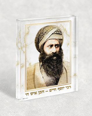 תמונה מרהיבה של הבן איש חי, הרב יוסף חיים מבגדד, על רקע שיש לבן וזהב, יוצרת תחושת יוקרה וקדושה גם יחד. הדמות מופיעה במרכז הבלוק כשהיא מוקפת במסגרת זהב עדינה שמוסיפה ברק ואלגנטיות. הכיתוב “רבי יוסף חיים – הבן איש חי” בגוון זהב בחלק התחתון מעניק ליצירה נוכחות מכובדת ומאוזנת.