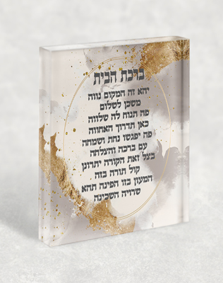 בלוק זכוכית אקרילי הכולל את נוסח ברכת הבית, בעיצוב מודרני שמעניק תחושת רוגע, איזון וברכה. הקווים הנקיים, הגוונים העדינים והטיפוגרפיה המדויקת משתלבים יחד לכדי פריט עיצובי שמכבד את החלל ומשרה בו שלווה.