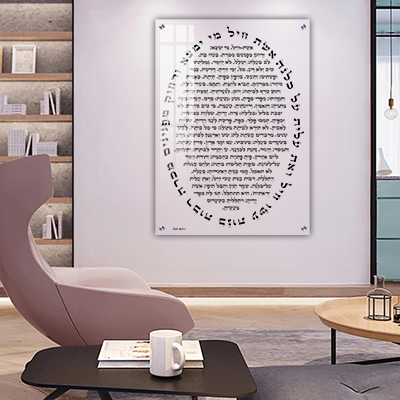 הברכה מודפסת על זכוכית אקסטרה קליר שקופה ומחוסמת. השקיפות הגבוהה מדגישה כל תו, והעיצוב האליפטי שומר על הרמוניה עיצובית. התוצאה מרשימה, נקייה ונוגעת.