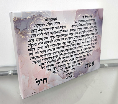 הטקסט של ברכת אשת חיל יוצר צורת לב ייחודית ומרשימה. כל שורה משתלבת בהרמוניה ויוצרת קומפוזיציה מרגשת. הצורה מוסיפה רובד רגשי עמוק לברכה הקלאסית.