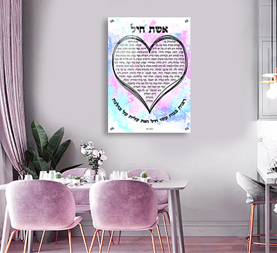 ברכת אשת חיל בצורת לב על קנבס או זכוכית – צבע, נוכחות וכבוד נשי