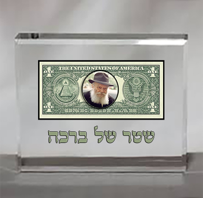 בלוק זכוכית מעוצב עם תמונה של הרבי ושטר דולר