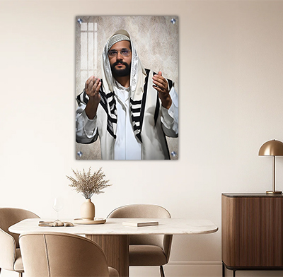 השילוב בין הדיוקן לבין ההדפסה על זכוכית או קנבס מעניק ליצירה מראה יוקרתי ומודרני. התמונה מתאימה לחללים המעוניינים בשילוב של רוחניות עם עיצוב אלגנטי.