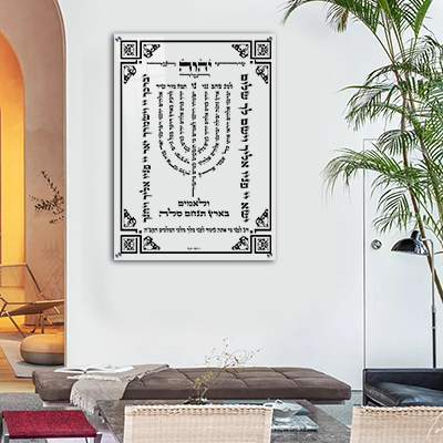 הפסוקים מסודרים בדמות מנורה, כשהם משתלבים בעדינות ובדיוק רב. כל זרוע מכילה פסוק, והכול יחד יוצר צורה הרמונית ומרוממת. זהו עיצוב שמשלב בין מסורת עתיקה לאסתטיקה מודרנית.