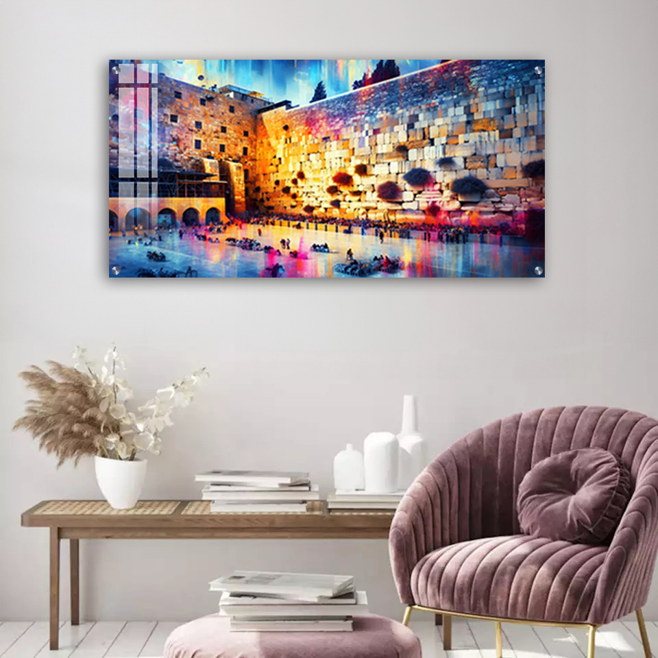 ציור פנורמי מרהיב של הכותל המערבי. גווני כחול, זהב, ורוד ווצהוב מתמזגים יחד ומעניקים לתמונה חיות ועומק. כל פרט בציור משדר שמחה, השראה ואור ירושלמי שמאיר את הלב.