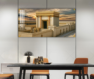 האור החמים של השקיעה מציף את חזית המקדש בזוהר נדיר ומאיר את הסביבה באווירה אלוקית. זהו רגע של קדושה ותקווה שנלכד בתמונה אחת וממלא את החלל באור חיובי ובאנרגיה של גאולה. כל פרט בציור מדויק עד לרמה הגבוהה ביותר ומעביר תחושת מציאות אמיתית של חזון הבית השלישי.