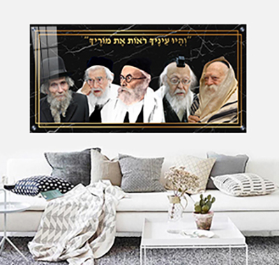 תמונה מעוררת השראה המציגה את פניהם של גדולי הרבנים והצדיקים: הרב חיים קנייבסקי, הרב יוסף שלום אלישיב, החזון איש – הרב אברהם ישעיהו קרליץ, הרב אלעזר מנחם מן שך והרב אהרן יהודה לייב שטיינמן. הרקע בעיצוב שיש שחור עם נגיעות זהב יוצר מראה מלכותי, חמים ומכובד.
