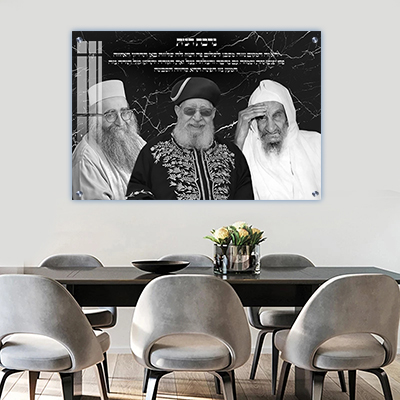 התמונה מאחדת שלושה רבנים: הרב עובדיה יוסף, בבא סאלי והרב יאשיהו פינטו יחד עם ברכת הבית. החיבור בין הדמויות לברכה יוצר השראה חזקה ומוסיף תחושת קדושה.