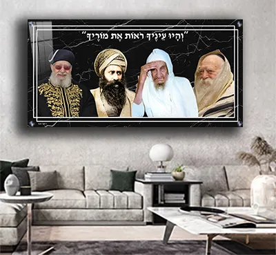 9046 – תמונת זכוכית או קנבס של רבנים על רקע שיש שחור עם פסוק: "וְהָיוּ עֵינֶיךָ רֹאוֹת אֶת מוֹרֶיךָ"