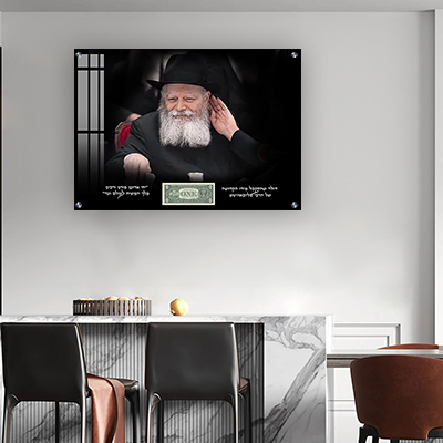 תמונת זכוכית של הרבי עם מקום לדולר המקורי – חיוך, קדושה ועיצוב אישי