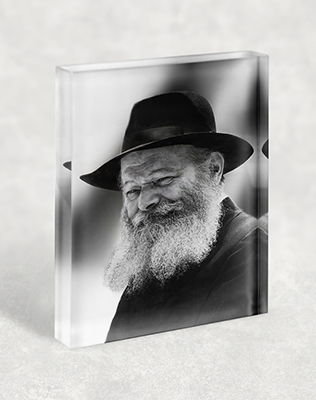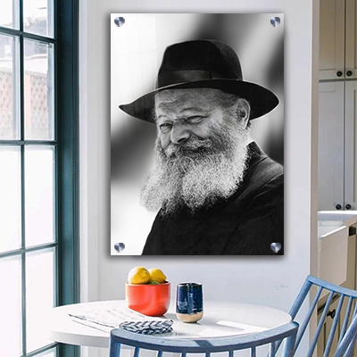 הרבי מליובאוויטש מחייך חיוך עדין. המבט החם, ההבעה הרכה והעיניים המאירות יוצרים תחושת קרבה. הדמות משדרת חום, חכמה וקבלה.